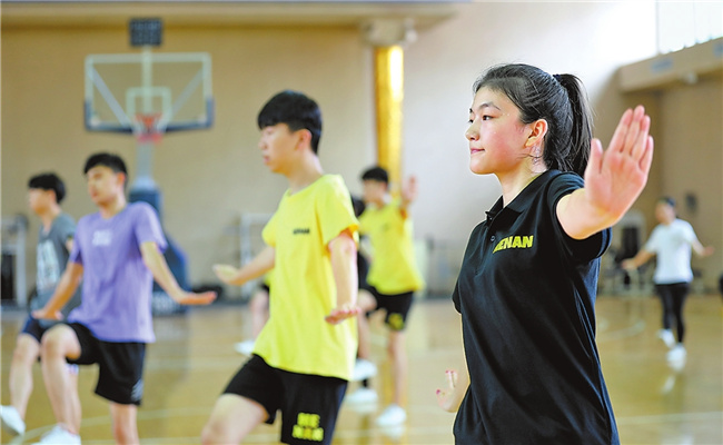 來自鄭州西亞斯學院和鄭州七中的18名運動員正在進行民族健身操訓練。