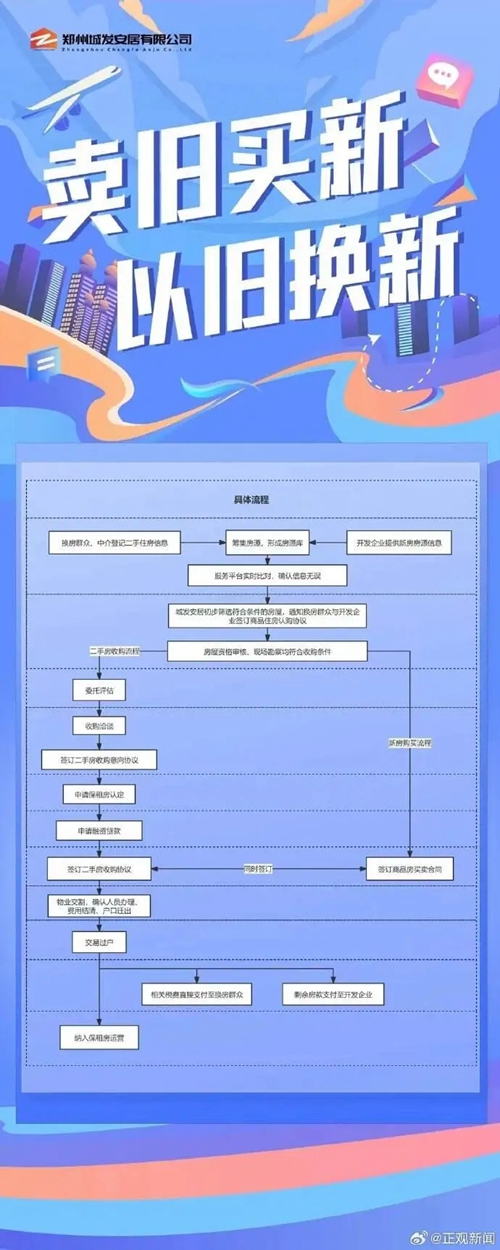 鄭州房產市場“賣舊買新、以舊換新”旨在滿足群眾改善性住房需求。具體來講,由政府指定收購主體—鄭州城市發展集團有限公司與具有改善需求的換房群眾進行洽談,通過價格評估、銀行貸款等一系列工作流程,收購群眾二手房源,為群眾購買新房提供資金支持,暢通買賣渠道。此外,群眾也可通過市場化方式進行交易。
