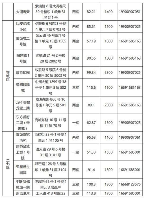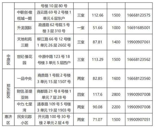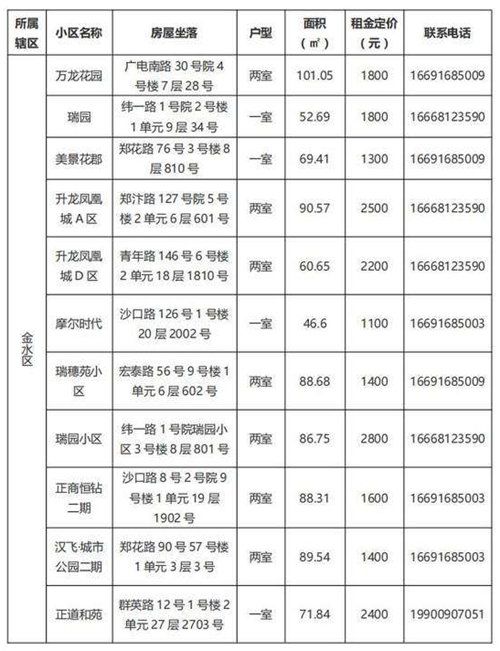 本批次配租房源共計32套,其中金水區12套、管城區7套、二七區8套、中原區1套、鄭東新區3套、惠濟區1套。水電費均為民用水電標準,物業費為各小區物業收費標準,房源精裝修交付,周邊配套設施齊全,配備家具家電,拎包入住,后續房源將根據裝修進度情況陸續配租。