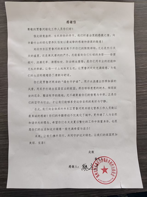 近日,鄭州市賈魯河綠化養護工作收獲暖心認可。鄭東新區崗李村村委向養護團隊贈送錦旗和感謝信,以“朝迎晨露修枝葉,暮披霞光護綠茵” 贊揚工作人員的辛勤付出。
