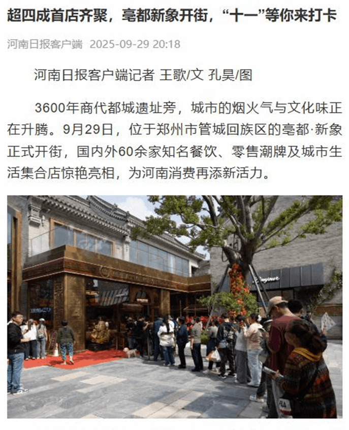 9月29日,備受矚目的城市更新標(biāo)桿項(xiàng)目——鄭州“亳都·新象”商業(yè)街區(qū)正式開街迎客。憑借著獨(dú)特的文化魅力與商業(yè)風(fēng)格,開街首日,街區(qū)人潮涌動(dòng),客流量突破10萬人次,項(xiàng)目取得了1億+的線上累計(jì)曝光量。不僅銷售業(yè)績表現(xiàn)亮眼,取得了轟動(dòng)性的開門紅,也收到了業(yè)界專家發(fā)來的賀詞和眾多媒體的報(bào)道。
