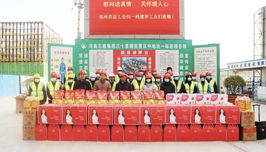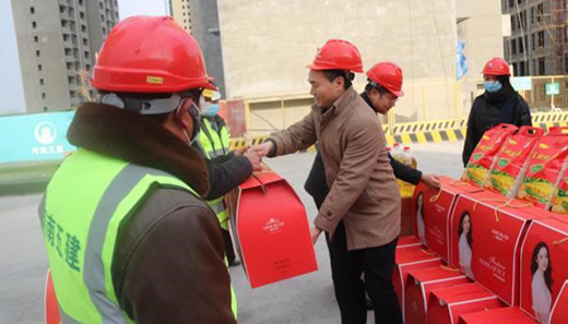 春節將至,為將工會組織的溫暖及時送到廣大工友手中, 2月7日下午,鄭州市總工會機關工會主任王銀倉、副主任張翔宇,鄭州地產集團監事會主席、工會主席李靜波、女工主任鄭琪在西流湖公司副總經理、工會主席昌磊的陪同下,深入中原新區三十里鋪中安置區施工現場,開展春節送溫暖慰問活動。