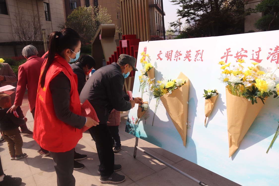 入口處的英烈追思展板吸引了居民們的注意,展板上牛皮紙制作的花束中已經(jīng)放入了不少黃色或白色的小菊花。支部黨員志愿者魯照宇向居民們介紹:“由于疫情原因,不建議集聚在烈士陵園祭祀,我們倡導(dǎo)文明祭祀、綠色祭祀,希望以這種特殊的方式祭奠革命先烈,營(yíng)造良好社會(huì)風(fēng)尚。”居民們拿過(guò)一支支小菊花親手粘貼在追思展板上表達(dá)對(duì)英烈的敬意,并寫(xiě)下追憶英雄烈士的留言。