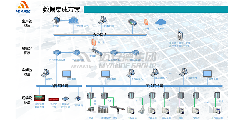 邁安德基于最新的工業(yè)4.0理念,通過工廠內(nèi)部網(wǎng)絡(luò),對各車間生產(chǎn)數(shù)據(jù)通過PLC進(jìn)行采集,與實(shí)際業(yè)務(wù)數(shù)據(jù)(采購、原料、批次、運(yùn)輸、生產(chǎn)、化驗(yàn)、倉儲、銷售、財(cái)務(wù)等)充分結(jié)合,運(yùn)用數(shù)據(jù)整合、報(bào)表分析使客戶實(shí)現(xiàn)全廠生產(chǎn)運(yùn)營過程的自動化、透明化、可視化、精益化、數(shù)據(jù)化,打造全新的智能化工廠。