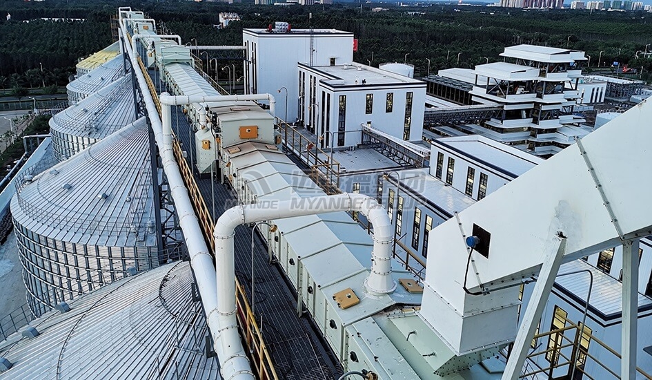 筒倉內配置有清倉機,將不能自溜的原糧清掃至倉底輸送設備,完成最終出倉。投料坑配置篦塵器,輸送設備配置除塵系統(tǒng),保證卸糧、進出倉時粉塵不外溢。